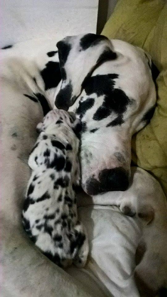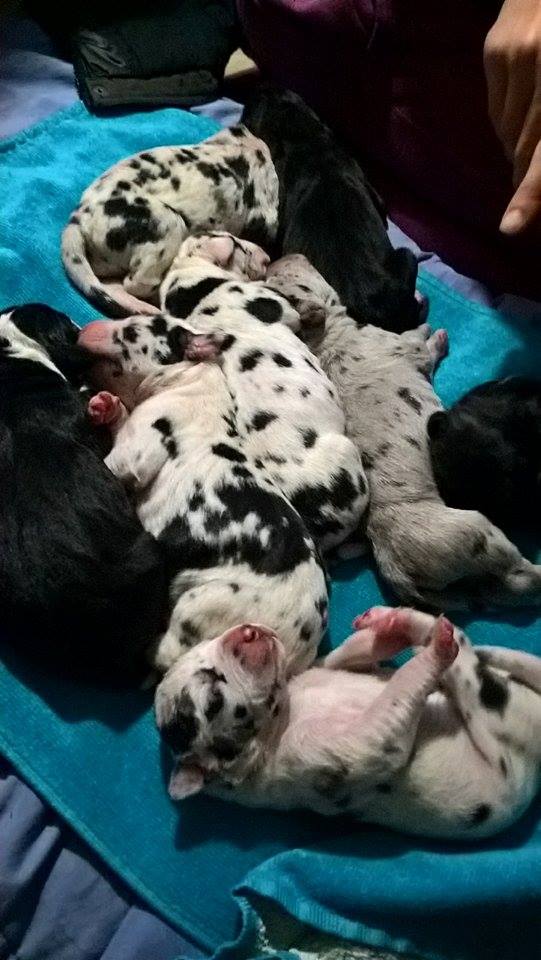 Sono nati 11 Cuccioli: 1 M e 1 F Nero, 1 M e 2 F Mantel Tiger, 3 M e 2 F Arlecchino, 1 M Arlecchino a Fondo Grigio (Merle).