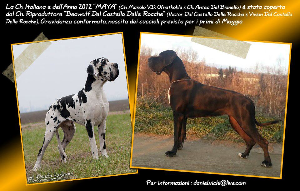 L' "Allevamento dell' Antico Tiferno" comunica che la femmina nera Ch. It. Maya (Ch. Manolo Von der Ofnenthohle x Ch. Antea del Bianello) è stata coperta dal maschio arlecchino Ch. Ripr. Beowulf del Castello delle Rocche (Victor del Castello delle Rocche x Vivian del Castello delle Rocche)...si attendono i cuccioli per i primi di Maggio.
